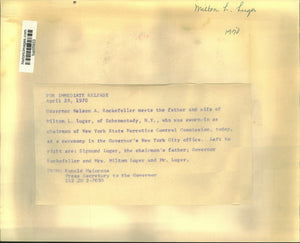 New York - Governor Nelson A. Rockefeller meets the father and wife of Milton L. Luger, of Schenectady, who was sworn-in as chairman of New York State Narcotics Control Commission, today, at a ceremony in the Governor's New York City office. Left to right are: Sigmund Luger, the chairman's father; Governor Rockefeller and Mrs. Milton Luger and Mr. Luger.