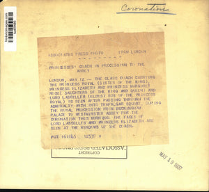 London - coronation - The glass coach carrying the Princess Royal (sister of the king), Princess Elizabeth and Princess Margaret Rose (daughters of the king and queen) and Lord Lascelles (eldest son of the Princess Royal) is seen after passing through the admiralty arch into Trafalgar Square, during the royal procession from Buckingham Palace to Westminster Abbey for the coronation this morning. The faces of Lord Lascelles and Princess Elizabeth are seen at the windows of the coach