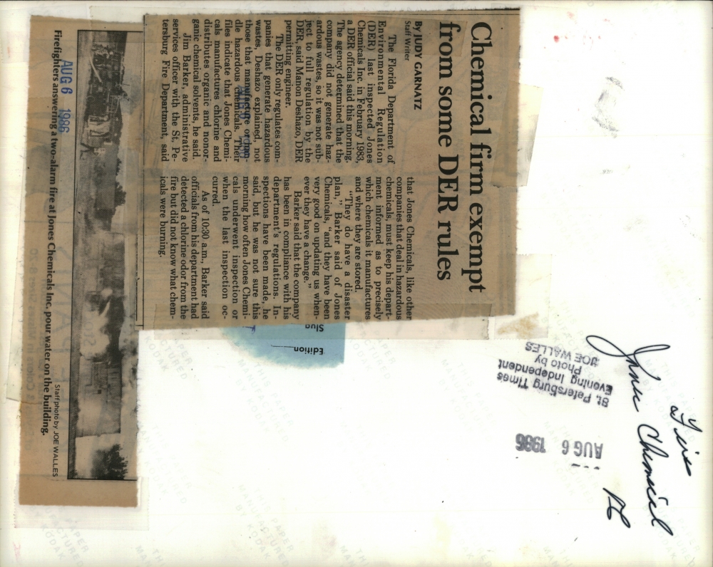1986 Press Photo firemen battling blaze at Jones Chemical, Inc. in Florida