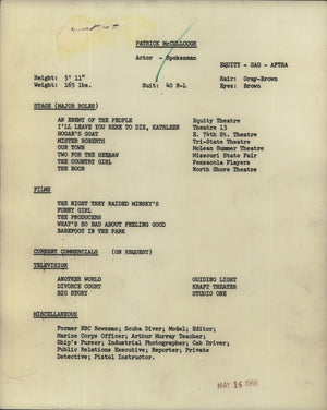 McCulloughE™s resume appears on back side of photo. Notable films include Funny Girl,E and The ProducersE.