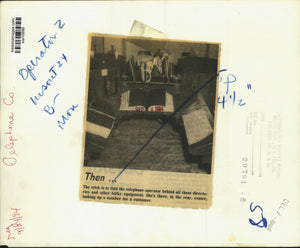 Then... The trick is to find the telephone operator behind all these directories and other bulky equipment. She's there, in the rear, center, looking up a number for a customer. Telephone company