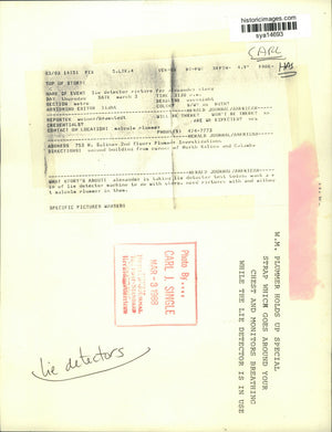 Lie Detectors W.M. Plummer holds up special strap which goes around your chest and monitors breathing while the lie detector is in use. Malcolm Plummer 753 N. Salina, 2nd floor, Plummer Investigations. Second building from corner of North Salina and Columbus. Alexander is taking lie detector test today. Want a pix of lie detector machine to go with story. Need pictures with and without Malcolm Plummer in them.