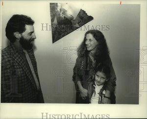 John Winland speaks with Denise Stillwater Leone and her daughter Annie. The artwork on the wall is Leone's.