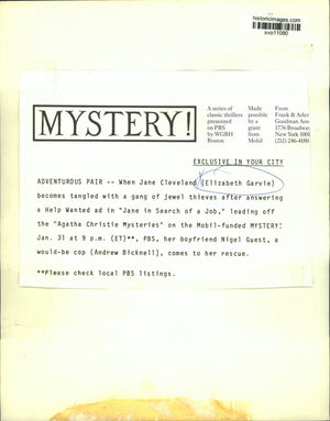 When Jane Cleveland (Elizabeth Garvie) becomes tangled with a gang of mewl thieves after answering a Help Watned ad in "Jane in Search of a Job," leading off the "Agatha Christie Mysteries" on the Mobil-funded Mystery! January 31, PBS, her boyfriend Nigel Guest, a would-be cop (Andrew Bicknell), comes to her rescue.
