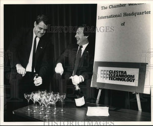 Clestra S.A. president Jean Charles Pauze and Cleanroom Technology president Lawrence Wetzel pop champagne to announce merger of companies at the Syracuse Chamber of Commerce headquarters.