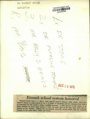 Etowah County, Alabama - Etowah school system honored...Etowah County Superintendent C.C. Davis, right, and his project director, Billy Rains, were presented a plaque of achievement by the United States Office of Education and the Alabama State Board of Education for the county's unique teaching program. A pilot project in the nation, it enables students at seven high schools to take the same class at the same time under the direction of one teacher. Making the presentation were Dr. Ernest Stone, educator, left, Dr. O.R. Futrelle Temple of the state office, Rains and Davis.
