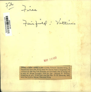Fires, Fairfield: Victims. Little Edward Jerome King, 4, found ou that the Army and Air Force hasn't forgotten the victims of the big fire Monday at Fairfield. He is trying on a pair of shoes brought him by Sergeant Horace A. Wilson, kneeling at left. With him are the Reverend D.B. Edwards, left, and the child's father, Herman King.