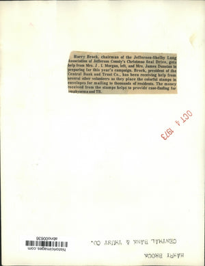 Harry Brock, chairman of the Jefferson-Shelby Lung Association of Jefferson County's Christmas Seal Drive, gets help from Mrs. J. I. Morgan, left, and Mrs. James Dunstan in preparing for this year's campaign. Brock, president of the Central Bank and Trust Company, has been receiving help from several other volunteers as they place the colorful stamps in envelopes for mailing to thousands of residents. The money received from the stamps helps to provide case-finding for emphysema and TB.