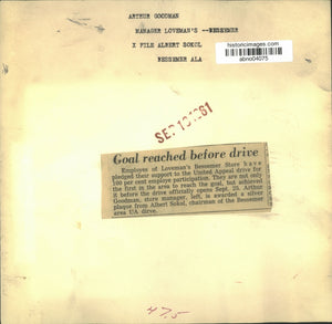 Arthur Goodman, Manager Loveman's- Bessemer x file Albert Sokol Bassemer, alabama. Goal reached before drive... Employees of Loveman's Bessemer Store have pledged their support to the United Appeal Drive for 100 percent employee participation. They are not only the first in the area to reach the goal, but achieved it before the drive officially opens Sept. 25. Arthur Goodman, Store manager, left, is awarded a Silver plaque from Albert Sokol, chairman of the Bessemer area United appeal drive.