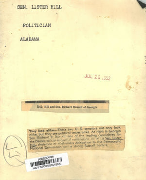 These two United States senators not only look alike, but they see political issues alike. At right is Georgia Senator Richard B. Russell, one of the leading candidates for the Democratic presidential nomination. At left is Senator Lister Hill, chairman of Alabama's delegation to the Democratic National Conention and a strong Russell backer.