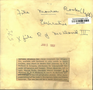 Seven completely new refrigerators, available with hardware in color motifs to match kitchens, were shown to dealers here yesterday by R.P. McDavid & Company, distributors for International Harvester refrigerators and freezers. Shown above are, left to right, Monroe Rooks, Harvester district manager; R.P. McDavid, III, R.P. McDavid, II, and R. H. Burnside, general manager of the I-H refrigeration division. Other dealer presentations will be made by Montgomery today and Mobile tomorrow. The new line will be in dealer showrooms soon.