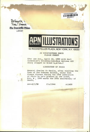 General Charles de Gaulle, after visiting the Tomb of the Unknown Soldier, walks down the Champs Elysees during the 1944 liberation of Paris as he's greeted by the crowd. Nov. 9, 1990 marks the 20th anniversary of death.