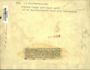 L.B. Sullivan, director, Alabama Department of Public Safety, kneels to inspect damage caused by a dynamite blast at a Shelby County construction job. Lt. Joe Smelley, chief state investigator, looks over the scene with him. Both arrived shortly after explosives were set off under a dragline Sunday. L.B Sullivan, kneeling, Director Alabama Department Public Safety, LT Joe Smelley (standing) chief State Investigator