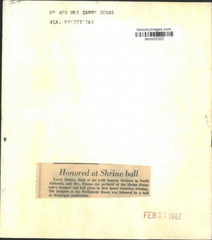 Honored at Shrine Ball - Larry Dumas, head of the 8,500 Zamora Shriners in North Alabama, and Mrs. Dumas are pictured at the Shrine Potentate's banquet and ball given in their honor Saturday evening. The banquet at the Parliament House was followed by a ball at Municipal Auditorium. Alabama politician