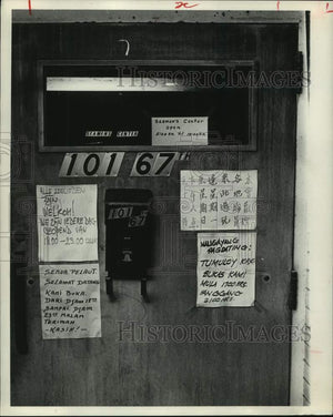 1969 Press Photo Greetings in multiple languages, Seamen's Center door, Houston