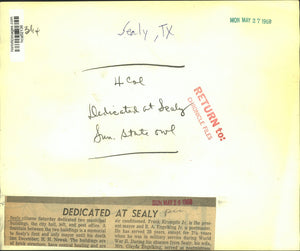 Dedicated at Sealy, Texas...Sealy citizens Saturday dedicated two municipal buildings, the city hall, left, and post office. A fountain between the two buildings is a memorial to Sealy's first, and only, mayor until his death Last December, H.H. Nowak. The buildings are of brick structure, have central heating and are air-conditioned. Frank Krampitz, Jr. is the present mayor and R.A. Engelking, Jr. is postmaster. He has served 28 years, except for 2 1/2 years when he was in military service during World War II. During his absence from Sealy, his wife, Mrs. Glayds Engelking, served as postmistress.