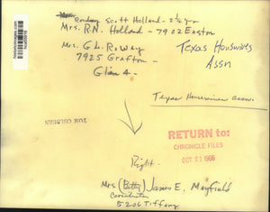 Randy Scott Holland - 2 1/2 years. Mrs. R.N. Holland - 7902 Easton. Mrs. G.L. Ronday - 7925 Grafton. Glen 4. Texas Housewives Association. Mrs. Betty James E. Mayfield. Coordinator. 5206 Tiffany.