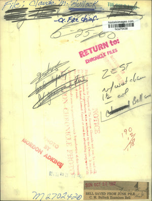 Bell saved from junk pile. C. M. Bullock examines bell. Claude M. Bullock - fire chief.