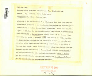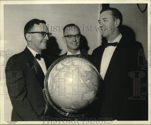 A highlight of the International Fair Scholarship Ball last night was the presentation of awards to six outstanding Houstonians who have made great contributions in various international categories. Shown receiving the lighted world globe for the "Highest Overall Contribution to International Trade and Travel" is George Carmack (right), editor of the Houston Press. Presenting the award is Sherwood Crane (left), chairman of the Ball. Watching is Edward J. Fay (center), director of the World Trade Center, who was also the recipient of an award for the outstanding contribution to the field of International Trade. Other recipients were: Mrs. Percy Selden, who was honored for her contribution to International Welfare; Felix Tijerina, for his contribution to International Understanding; David R. Taylor, for his contribution to International Travel; and Lt. Gen. A.D. Bruce, for his contribution to International Education.