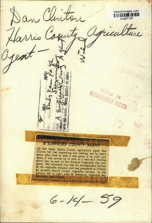 A surprised county agent. All last week, Harris County agriculture agent Dan Clinton felt that something was cooking, but he didn't know what kind of dish it was going to be until suddenly it was served up to him in a beautiful sterling silver tray as part of the Houston Vegetable Day program. The inscribed tray was for distinguished service to the vegetable industry and was presented to Clinton by grateful Harris County vegetable farmers. In the picture, left to right, John M. Robinson, vegetable day chairman and Clinton.