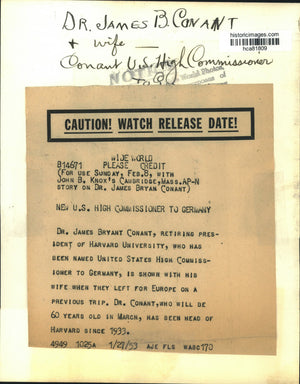 Dr. James Bryant Conant, retiring president of Harvard University, who has been named United States High Commissioner to Germany, is shown with his wife when they left for Europe on a previous trip. Dr. Conant, who will be 60 years old in March, has been head of Harvard since 1933.