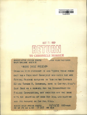 Among those present when President Franklin Delano Roosevelt dedicated the new Federal Reserve Building in Washington October 20 was Thomas G. Corcoran, down in Capitol Hill's Blue Book as counsel for the Reconstruction Finance Corporation, but credited off the book with the drafting of much New Deal legislation and its passage on Capitol Hill.
