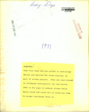 Superdog. Pups four days old are placed in centrifuge device and whirled for three minutes, as part of stress program. They are also placed in 32-degree refrigerator for one minute. Idea is for pups to undergo stress while being loved and cared for to condition them to accept challenge later on. Army - Dogs.