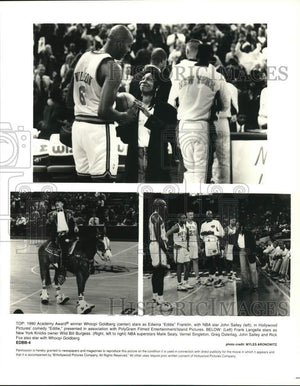 Top: 1990 Academy Award winner Whoopi Goldberg (center) stars as Edwina 'Eddie' Franklin, with NBA star John Salley (left), in Hollywood Pictures' comedy 'Eddie,' presented in association with PolyGram Filmed Entertainment/Island Pictures. Below (Left) Frank Langella stars as New York Knicks owner Wild Bill Burgess. (Right, left to right) NBA superstars Malik Sealy, Vernel Singleton, Greg Ostertag, John Salley and Rick Fox also star with Whoopi Goldberg.