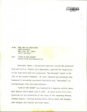 Moustapha Akkad, a Syrian-born American citizen who graduated from the U.C.L.A. Theater Arts Department, captured the imagination of the film world with his production, "The Message", based on the life of the prophet Mohammed. He later financed and presented John Carpenter's incredibly successful box-office hit, "Halloween", an economy-budget film that made millions. "Lion of the Desert" was inspired by a magazine article about Omar Mukhtar which Akkad read in 1974. He spent nearly five years preparing for his production of the story of the legendary Bedouin freedom fighter, starring Anthony Quinn, Oliver Reed, Rod Steiger, John Gielgud, Raf Vallone and Irene Papas.