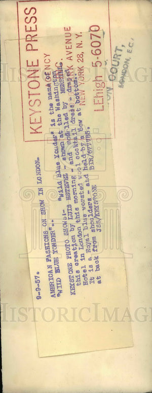 American Fashions On Show In London. "Wild Blue Yonder": Photo Shows "Wild Blue House" is the name of this creation by Luis Estevez - shown at the Washington Hotel in London this morning - and modeled by Merru~~. It is Royal Blue worsted wool cocktail dress - dress at back from shoulders - and held by a bow at bottom.