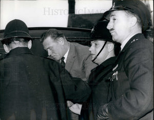 A Police Constable And Three Men Accused Of An $18,000 Bank Raid: 39-year-old Metropolitan Police Constable George Alberta Askew was charged with three other men at Waltham Cross Essex, yesterday of breaking into Chingford's National Provincial Bank and Stealing cash and Jewellery worth $18,103. The men and two women - a mother and daughter - were also accused of receiving part of the stolen money. All the accused were remanded for a week, the men in custody and the women on ball. Photo Shows With head bowed, Metropolitan Police constable George Albert Askew is escorted by his uniformed colleagues as he hurries into court yesterday to face a charge of robing a bank.