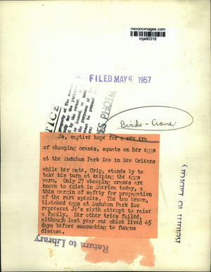 Jo, captive hope for a new era of whooping cranes, squats on her eggs at the Audubon Park Zoo in New Orleans while her mate, Crip, stands by to take his turn at keeping the eggs warm. Only 27 whooping cranes are known to exist in America today, a thin margin of safety for propagation of the rare species. The two brow, blotched eggs at Audubon Park Zoo represent Jo's sixth attempt to raise a family. Her other tries failed, although last year one chick lived 45 days before succumbing to fungus disease.