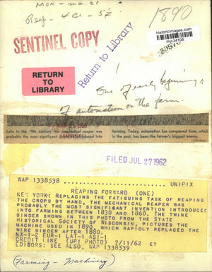 New York: Replacing the fatiguing task of reaping the crops by hand, the mechanical reaper was probably the most significant invention introduced into farming between 1830 and 1860. The twine binder shown in this photo from the State Historical Society of Wisconsin, pictures the machine used in 1890, which rapidly replaced the wire binder after 1880.