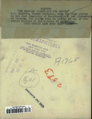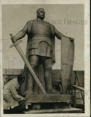 1930 Press Photo The Warrior by V H Seifert, German sculptor with huge statue he
