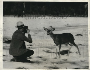 1931 Press Photo A man taking a picture of a deer at the Sequoia National Park