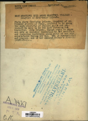 1919 Press Photo Charlotta Orlando, Daughter of Italian Ex-Premier - nef36861