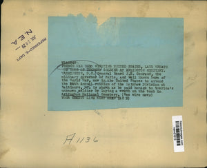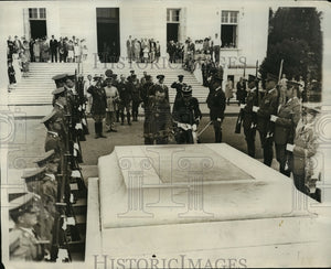 General Henri JE Gouraud, the military governor of Paris, and well known hero of the World War, now in the United States to attend the Annual reunion of the Rainbow Division at Baltimore, MD is shown as he paid homage to America;s Unknown Soldier by laying a wreath on the tomb in Arlington National Cemetery.