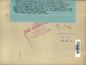 Practicing Military instruction in all it's combat branches is now being given to first and third class men at West Point. Photo shoes- General William R. Smith, Superintendent of the Academy, left, and Colonel Richardson, right as they inspected cadets on the artillery field of the Academy.