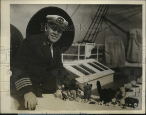 Sailors are famous for the talismen of luck which are supposed to insure safety for them on the high seas. But to Captain A.A. Sawyer of the S.S. Calawaii goes the record for such symbols. Sawyer, not content with the efficiency of one luck piece, has no less than 16 carved ivory tokens of coed FortuneE”The photo shows Capt. Sawyer and his "luck menagerie" when the Calawaii docked at Los Angeles Calif