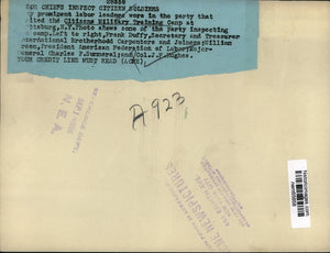 Prominent labor leaders were in the party that visited the Citizens Military Training Camp at Pittsburg, NY. Photo shows some of the party inspecting the camp. Left to right Frank Duffy, Secretary and Treasurer International Brotherhood Carpenters and Joiners, William Green, President, American Federation of Labor, Major General Charles P Summeral and Col JF Hughes.