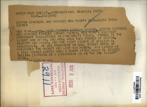 Mrs Mary Frances Clensay Galvin, Boston divorcee who married Frances Ormond French New York's socially prominent taxi driver in Cincinnati today. French is the eldest son of Mr & Mrs Amos Tuck French of Boston, Newport & Paris, and the 1st cousin of William H Vanderbilt. He was prominent in Wall Street until he misjudged the market and lost his money. His career as a taxi driver lasted only a month after which he started selling clothing on a commission in an "up one flight" store.