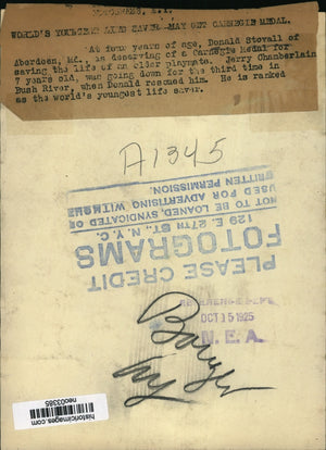 1925 Press Photo Donald Stovall, Awarded Carngie Medal for Friend's Rescue