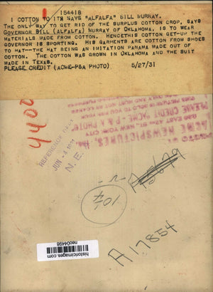1931 Press Photo Gov. Bill Alfalfa Murray of Oklahoma wearing cotton suit