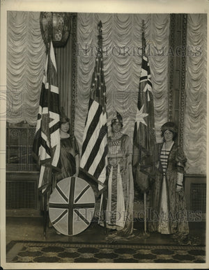 Ye Olde English Faire and Lights O'London held by the Imperial Order of the Daughters of the British Empire, U.S.A., Inc., at the Waldorf-Astoria hotel New York City, for the benefit of the Victoria Home for aged British Men and Women. Shown, left to right, are Miss E.L. Yonge, as Britainnia, Miss H. Hawley as Columbia and Miss Queenie Pembass as Australia.