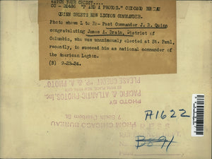 1924 Press Photo JR Quinn congratulating James A Drain of the American Legion