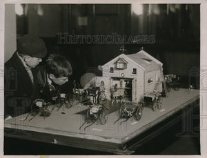 1931 Press Photo boys looking at model horse and carriage at Science Museum
