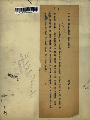 1925 Press Photo Auto Runs Off Bridge Lodged on Telegraph Pole