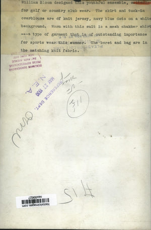 William Bloom designed this youthful ensemble for golf or country club wear. The skirt and tuck-in overblouse are of knit jersey, navy blue dots on a white background. Worn with this suit is a mesh chukker shirt -- a type of garment that is of outstanding importance for sports wear this summer. The beret and bag are in the matching knit fabric.