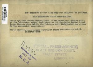 Princess Mary distributed the prizes to the successful competitors at the 28th Annual Competitions in Art, Music and Dance of the "childrens salon," which took place at the Connaught Room, Queen Street. Shown is Master Dennis Trehearne being presented to Princess Mary.