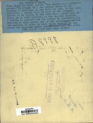 A record roll is made of the original letter to be typed, in the same way a piano roll is made. It is then inserted in the special machine. A button is pressed and the letter is automatically written at high speed. One of the advantages of the new machine is shown by Miss Clara Spriggs as she reads her magazine while the machine does her work.